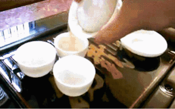 每一沖,都需要用熱水燙一遍茶杯,一方面是由于多人共用茶杯,另一方面是為了在倒茶時能保持茶湯的溫度。